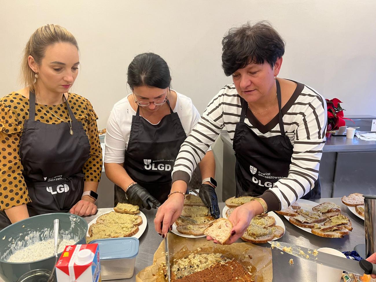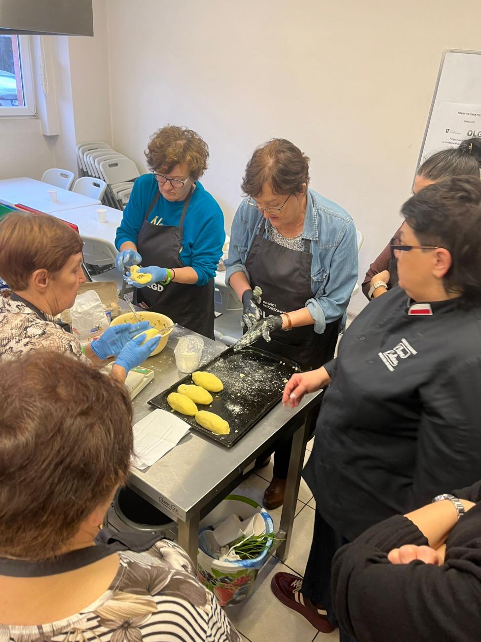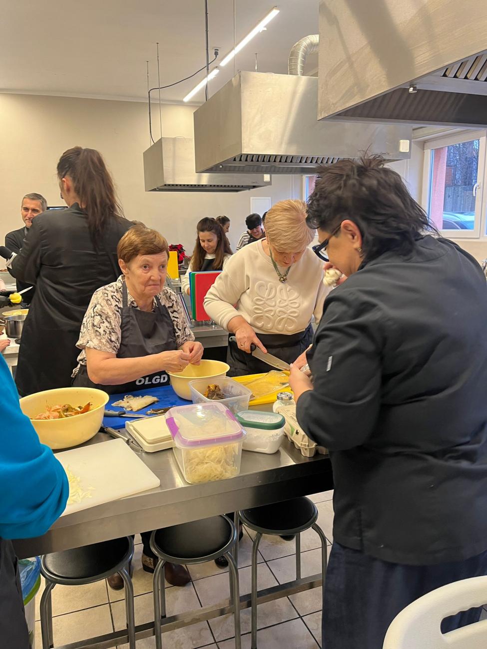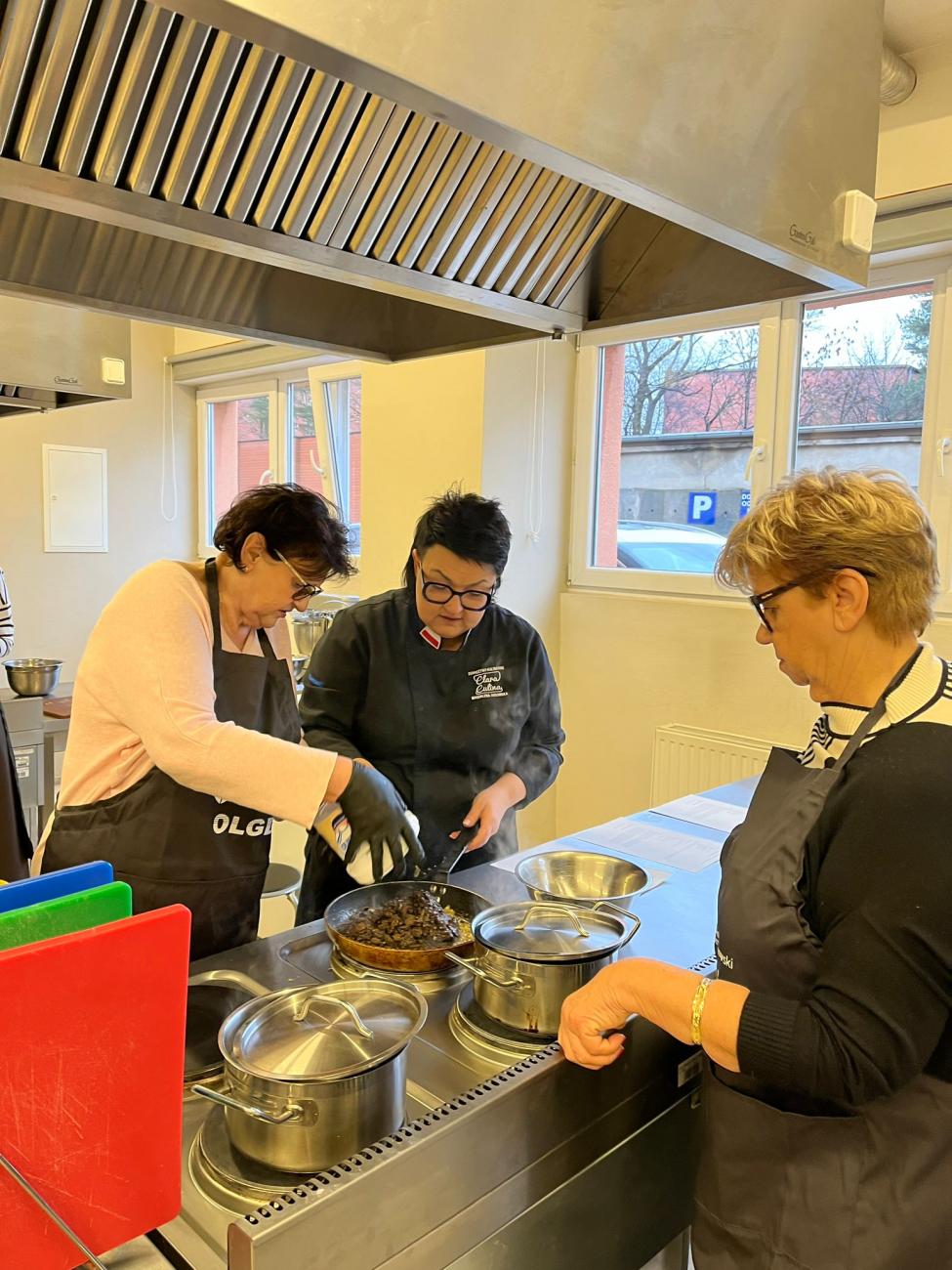 Piętnastoosobowa grupa uczestników przygotowywała tradycyjne potrawy wigilijne, poznając techniki kulinarne oraz lokalne świąteczne tradycje. Warsztaty przebiegły w twórczej atmosferze, sprzyjającej wspólnej pracy i wymianie doświadczeń.