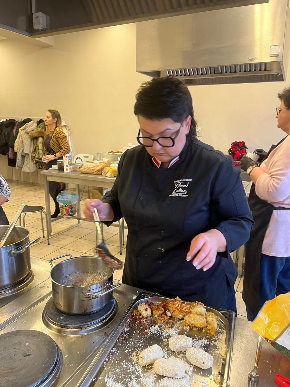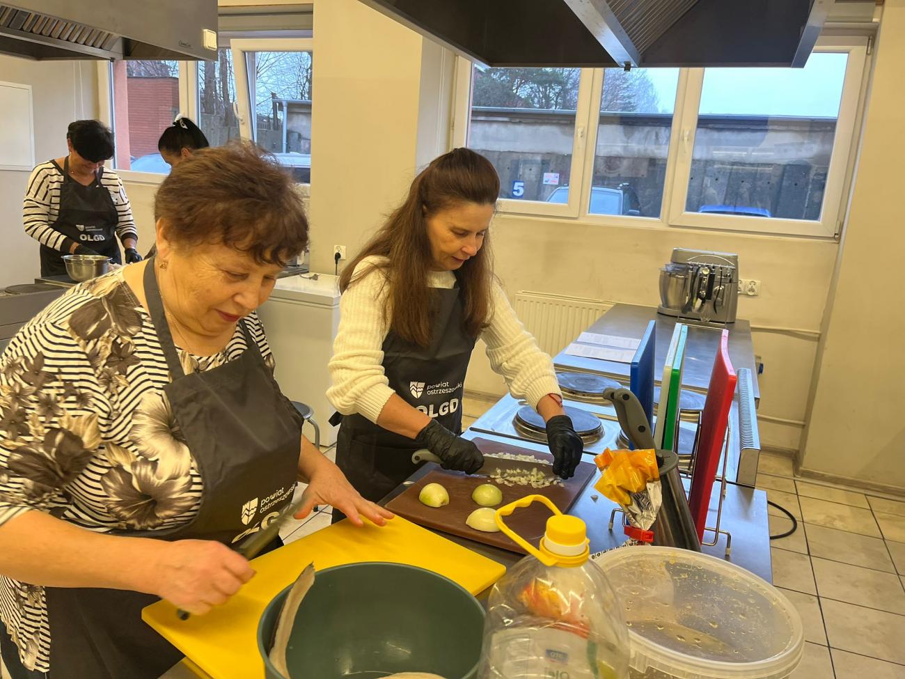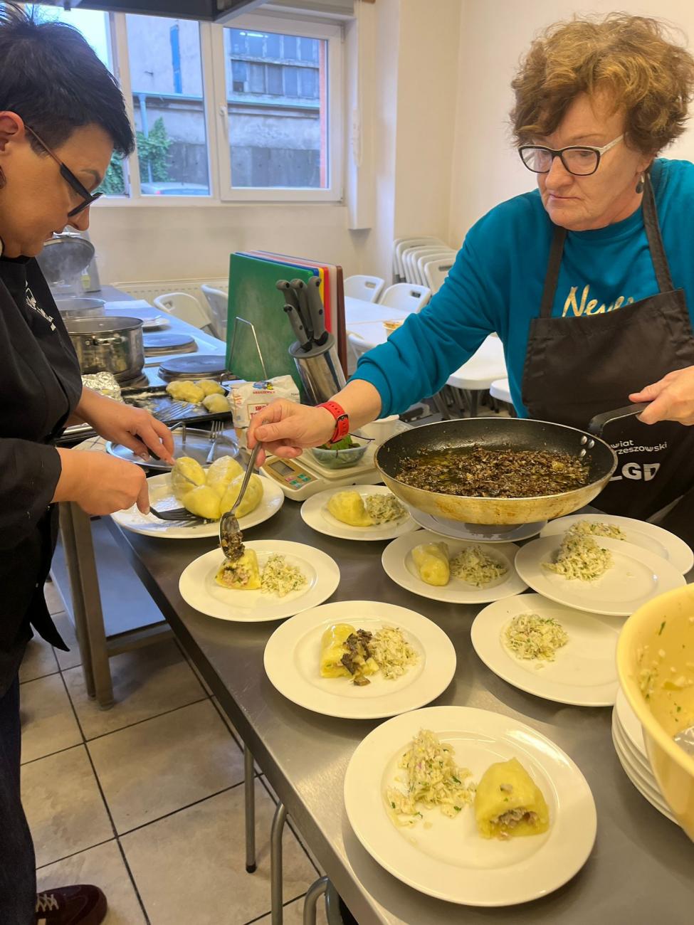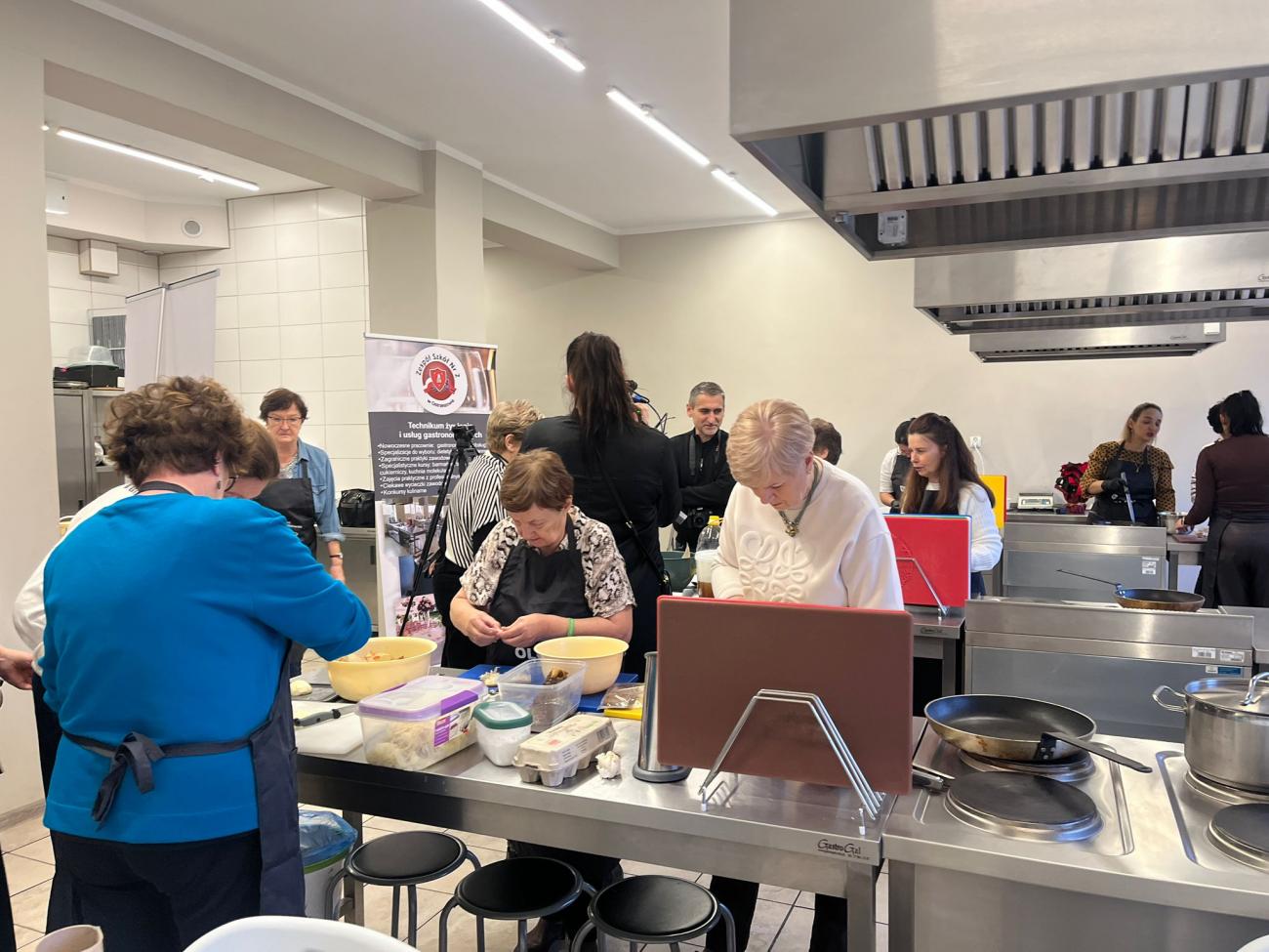 Piętnastoosobowa grupa uczestników przygotowywała tradycyjne potrawy wigilijne, poznając techniki kulinarne oraz lokalne świąteczne tradycje. Warsztaty przebiegły w twórczej atmosferze, sprzyjającej wspólnej pracy i wymianie doświadczeń.