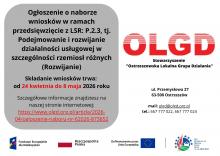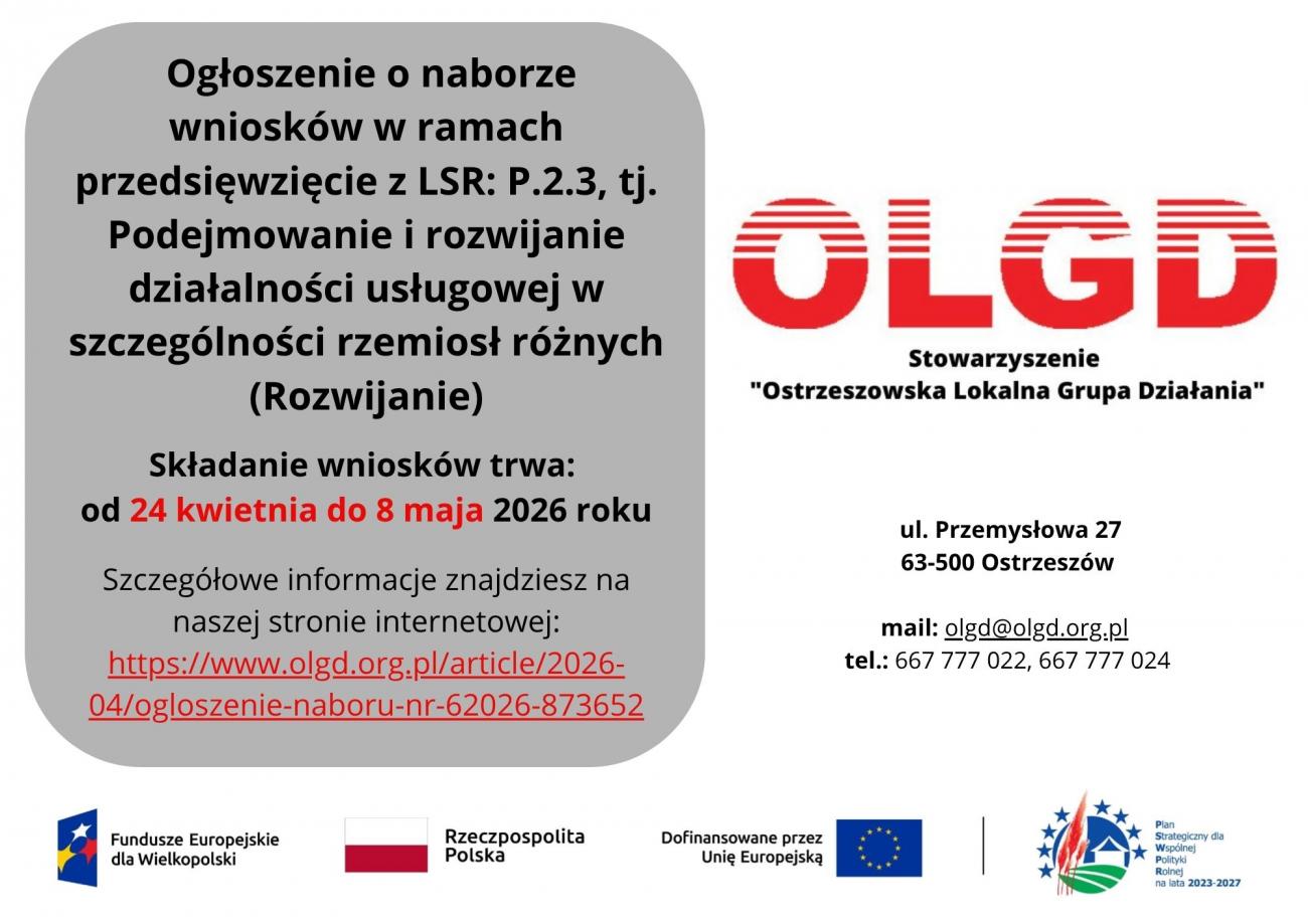 W ramach interwencji I.13.1 LEADER/Rozwój Lokalny Kierowany przez Społeczność z zakresu: : Rozwój przedsiębiorczości, w tym rozwój biogospodarki lub zielonej gospodarki poprzez: rozwijanie pozarolniczej działalności gospodarczej (rozwój DG), przedsięwzięcie z LSR: P.2.3, tj. Podejmowanie i rozwijanie działalności usługowej w szczególności rzemiosł różnych (Rozwijanie) objęte niniejszym ogłoszeniem, szczegółowe warunki przyznania pomocy określa „Regulamin naboru wniosków o przyznanie pomocy” opublikowany na stronie Stowarzyszenia „Ostrzeszowska Lokalna Grupa Działania”, www.olgd.org.pl .