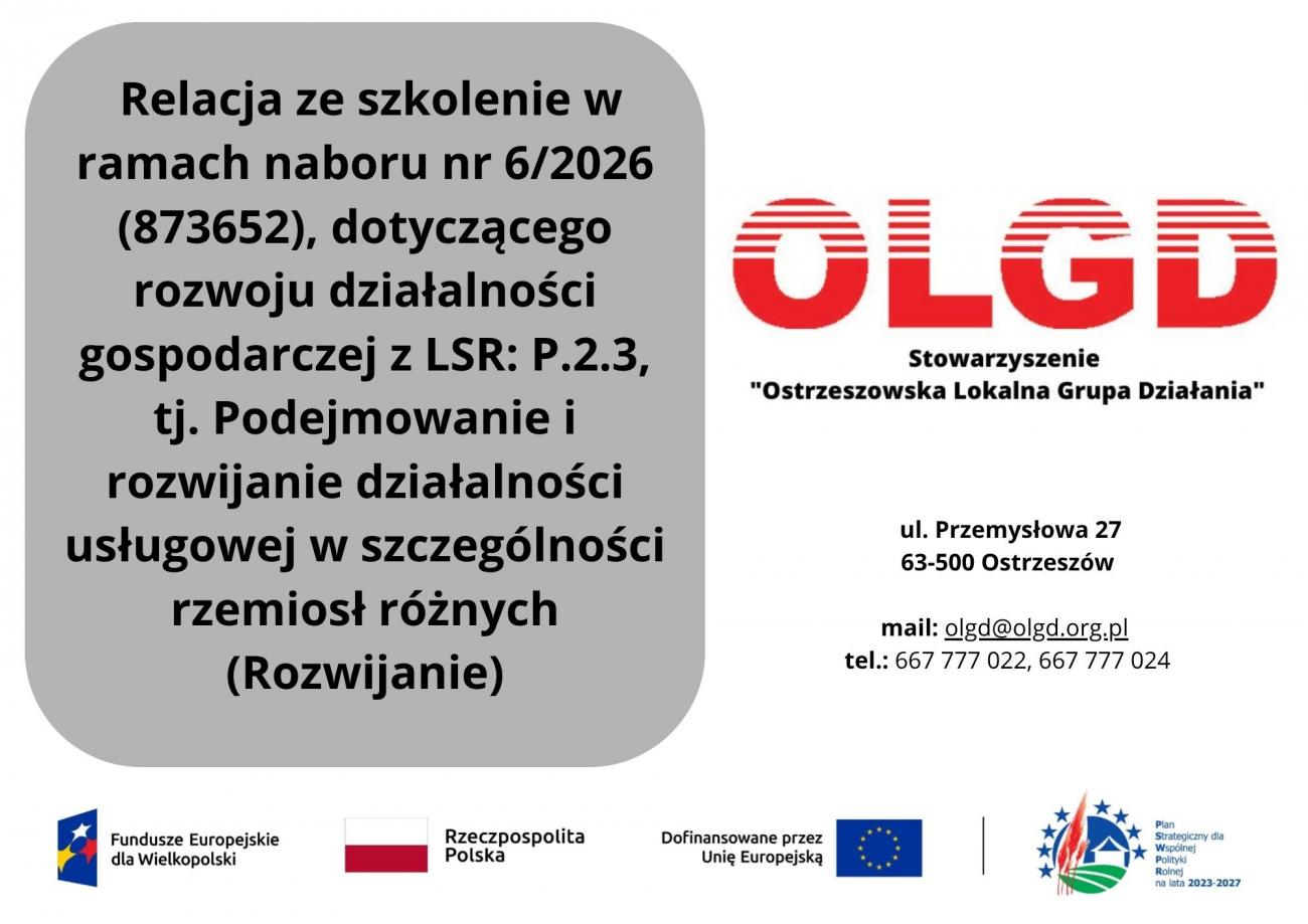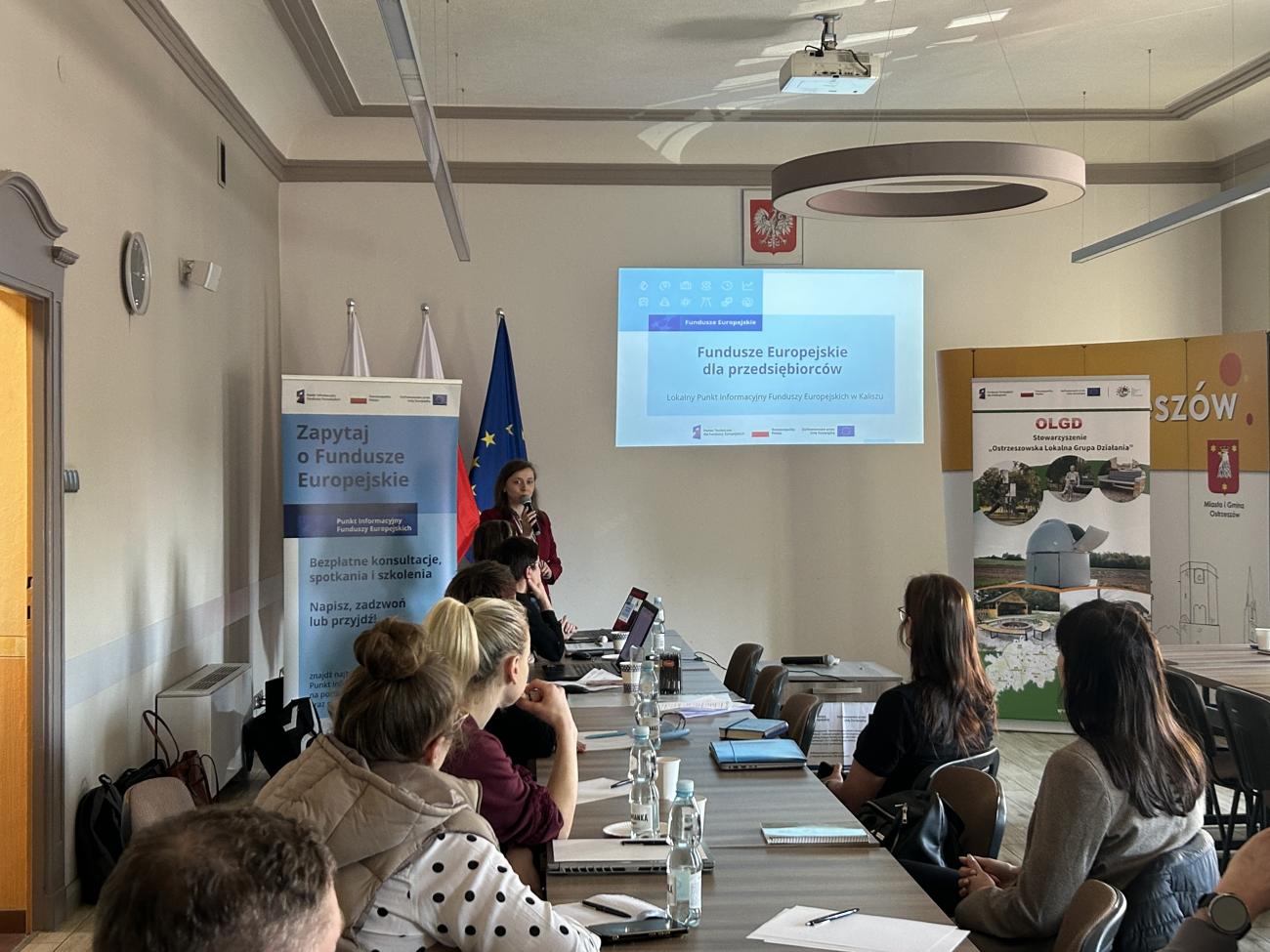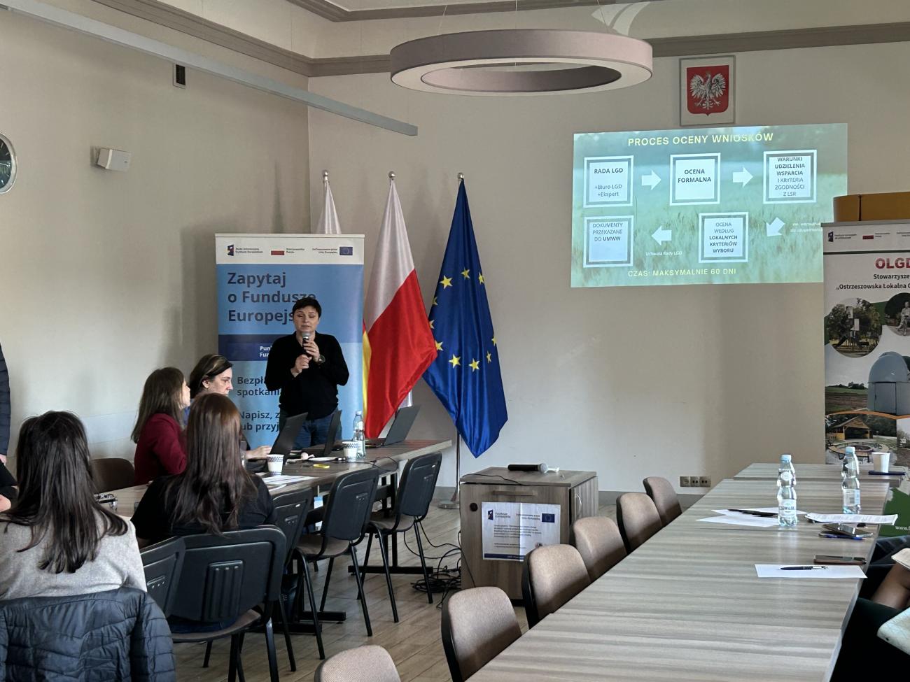 W dniu 10 kwietnia 2026 r. odbyło się spotkanie informacyjno-szkoleniowe organizowane przez Stowarzyszenie „Ostrzeszowska Lokalna Grupa Działania” dla potencjalnych wnioskodawców w ramach naboru nr 6/2026 (873652), dotyczącego wsparcia rozwoju działalności gospodarczej. Szkolenie przeprowadziła Prezes Wielkopolskiej Sieci LGD Małgorzata Blok. Podczas szkolenia mieliśmy również przyjemność gościć przedstawicielkę Lokalnego Punktu Informacyjnego Funduszy Europejskich w Kaliszu, która w swoim wystąpieniu przybliżyła możliwości wsparcia przedsiębiorców ze środków Funduszy Europejskich.